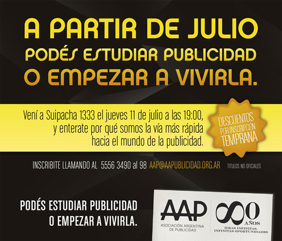 (ARGENTINA) – El próximo lunes 15 de julio da comienzo lo que la Asociación Argentina de Publicidad llama el Enlace: una modalidad de cursada que incluye clases hasta la primera semana de marzo, con un descanso único que va del 21 de diciembre al 19 de enero y permite a los que ingresan comenzar segundo año en marzo de 2014, junto a los que vienen cursando primero desde marzo pasado. ¿No vale la pena averiguar? Hay una charla informativa mañana, jueves 11, a las 19.