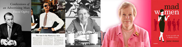 De izquierda a derecha, la portada del libro más famoso de David Ogilvy, el famoso hombre (emparchado) de las camisas Hathaway, Jane Maas por dos (en sus tiempos de redactora publicitaria y en la actualidad) y el libro que escribió como respuesta a la locura mundial que provocó «Mad Men».