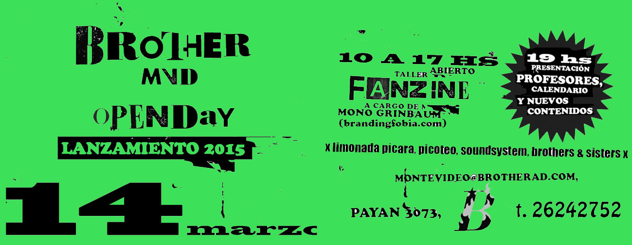 El próximo sábado 14 de marzo la sede uruguaya de la red de escuelas creativas va a abrir las puertas de su nueva sede, y estás invitado. La jornada va a ser gratuita, comenzando desde las 10 de la mañana con un Taller de contenido en Fanzine (una técnica en la que se realizan afiches en base a collages y copias en blanco y negro) a cargo del Mono Grimbaum (por Brother Buenos Aires) y Germán Ferrés (Head of Art de Brother Montevideo). En adición, hacia las 6 de la tarde se realizará el lanzamiento de Brother 2015-2016, presentando a todo el gran equipo de profesores, las nuevas propuestas de cursos, talleres y contenidos.