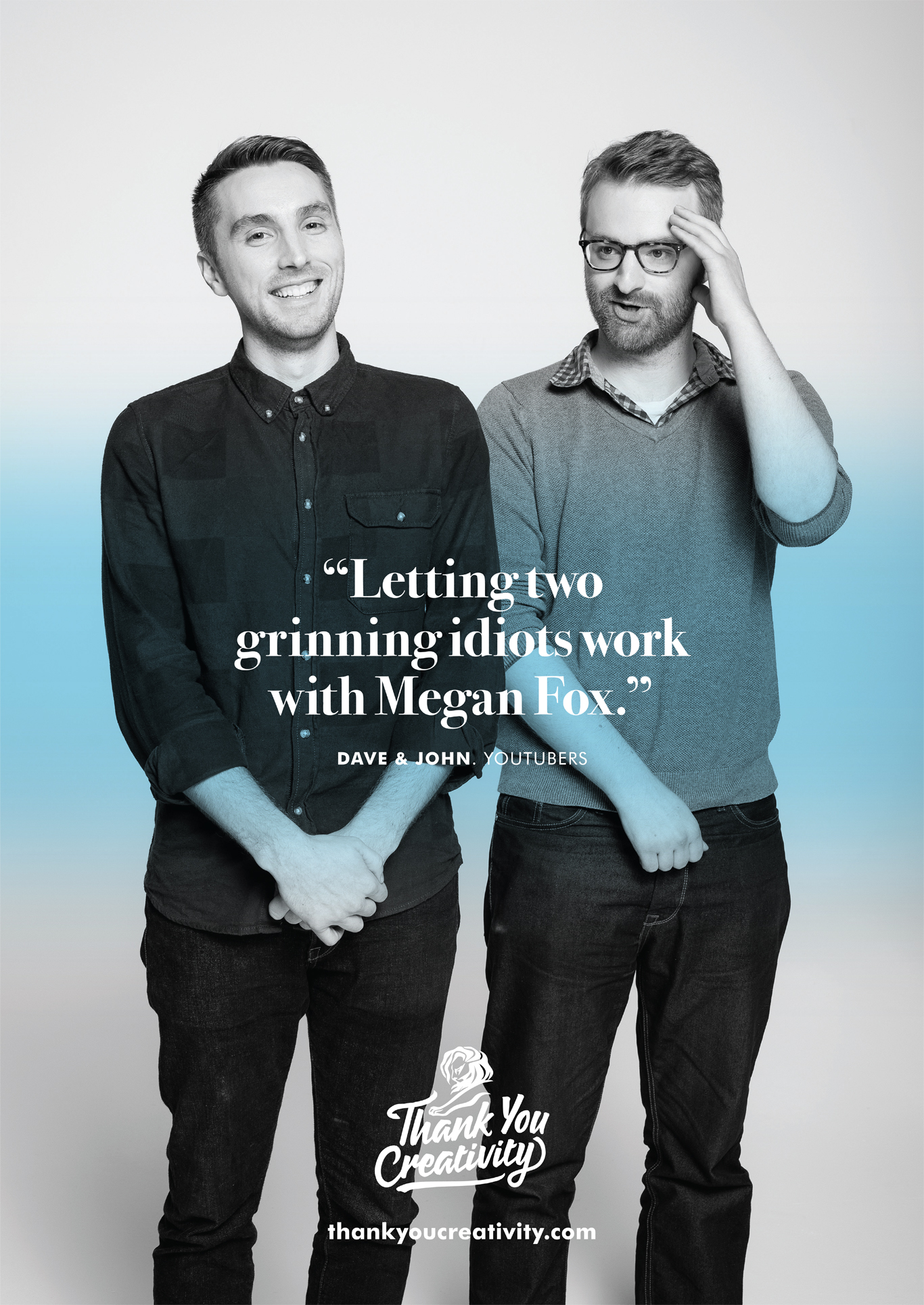 Una selección de los posters de la campaña donde profesionales le agradecen a la creatividad: «Permitirme encontrar belleza todos los días», «Dejar que dos idiotas trabajen con Megan Fox», «Darme un trabajo que no se siente como un trabajo» y «Por cada conversación que llevó a una nueva idea».