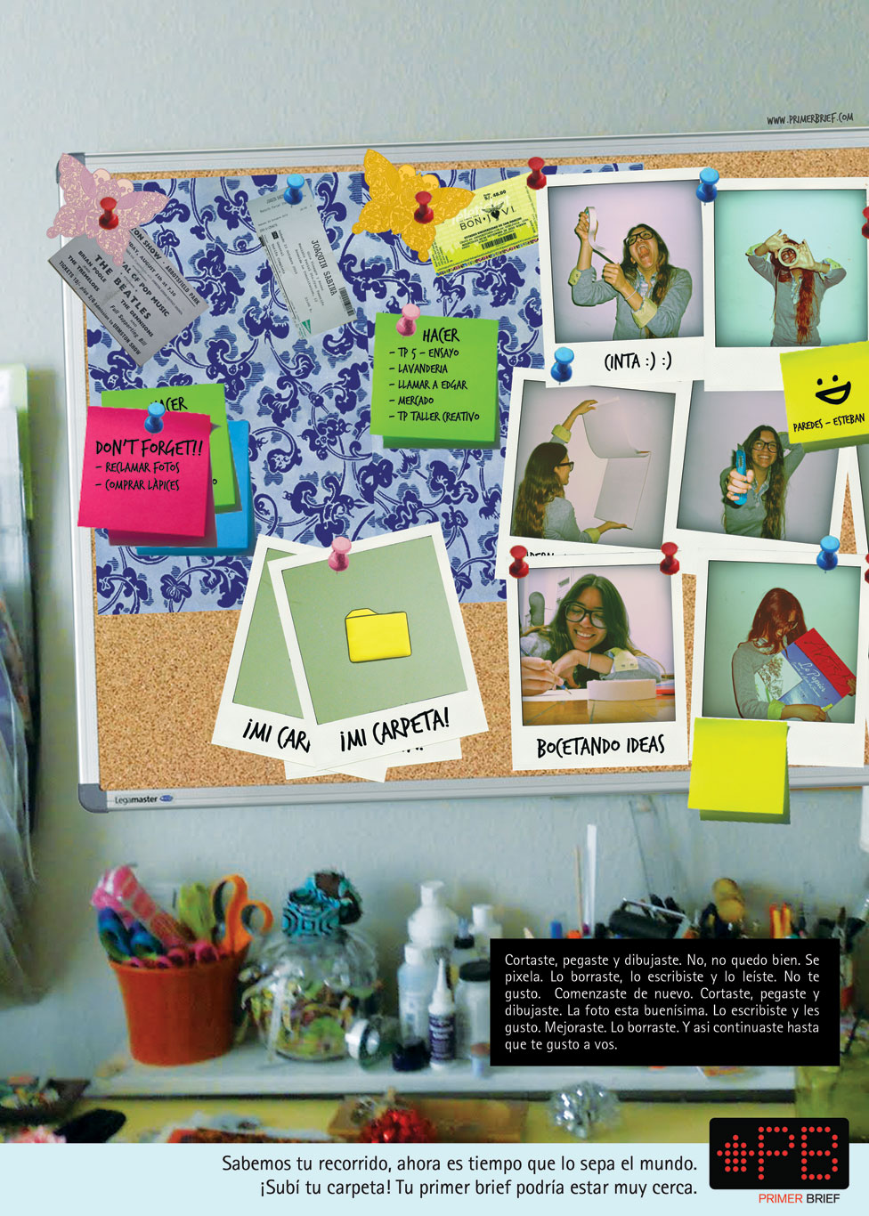 CARPETA es una sección pensada para exhibir los trabajos de los futuros publicitarios que suelen incluirse en una carpeta de presentación: anuncios gráficos, comerciales, afiches, guiones de TV o de radio, acciones, casos, etc; y también trabajos de corte más artístico, como fotografías, cortometrajes, videoclips, textos literarios, etc.