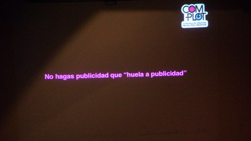 «No sigas modas, busca dentro tuyo»; «No hagas publicidad que ‘huela a publicidad'»; «En ningún caso mates buenas ideas por la dificultad de producirlas»; «No te autocensures»; «Quita de tu cabeza frases como ‘El cliente no lo aprobaría’ o ‘La gente no lo entenderá'»; «Sé buena persona»; y muchísimas otras fueron las frases que durante esas dos horas fueron proyectándose en la pared y recibiendo infinidad de explicaciones y ejemplos por parte de ambos.