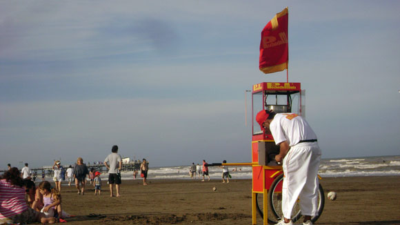 La Lucila del Mar, 7.30 de la tarde del penúltimo día de 2011: cuando ya casi no quedan posibles clientes en la playa, un vendedor de Pochoclo Manía cierra las ventas del día.