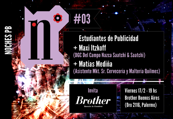 (ARGENTINA) – Maxi Itzkoff, codirector general creativo en Del Campo Nazca Saatchi & Saatchi, y Matías Mediña, asistente senior de marketing en Cervecería y Maltería Quilmes, serán los anfitriones de la tercera NOCHE PB, que se realizará el viernes 17 en la sede palermitana de la escuela de creativos Brother Buenos Aires. El acceso será libre y gratuito, pero sólo podrán asistir los 30 primeros que lo confirmen en el evento de la COMUNIDAD PB en Facebook. ¿Te prendés?